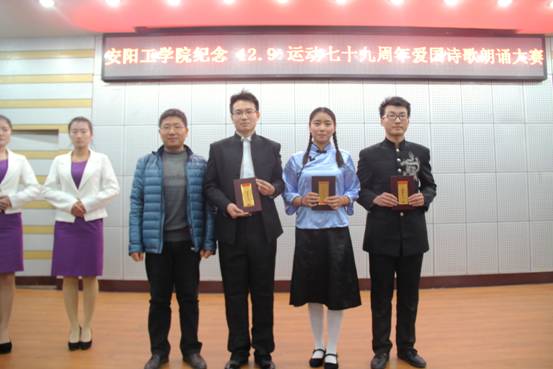 晚上7点,我校在学术报告厅举办纪念一二九运动七十九周年爱国诗歌朗诵比赛,本次比赛的嘉宾评委有团委老师王伟、李国云及各院系团总支书记。安阳师范学院的同学和我校各院系学生代表四百余人观看比赛。比赛由文法学院同学李丹晨,岳辰主持。