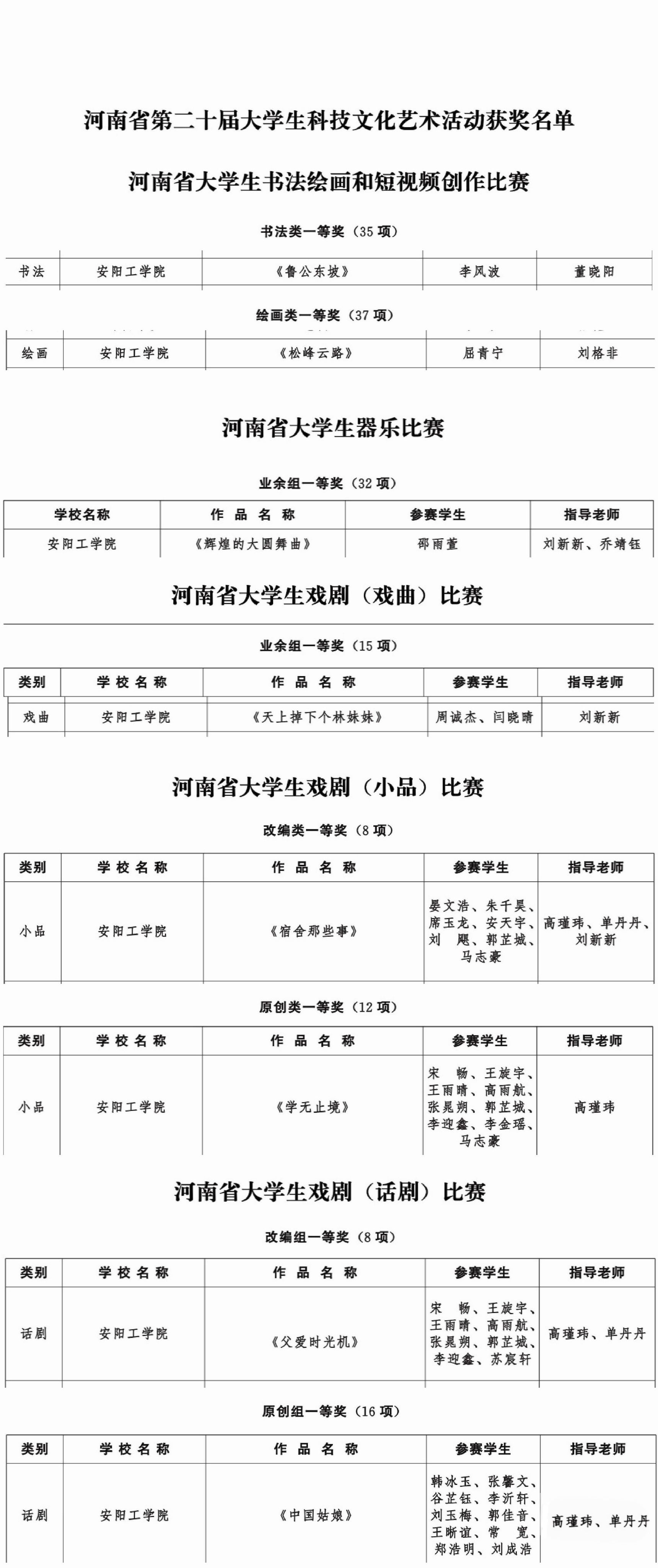 本届活动自今年5月举办以来,校团委高度重视、积极宣传、广泛发动、精心组织,做好统筹协调和服务保障工作,择优推选出了16项作品参加省赛,最终14件作品获得奖项,其中艺术设计学院屈青宁同学的作品《松峰云路》(指导教师为刘格非)、李风波同学的作品《鲁公东坡》(指导教师为董晓阳)获河南省大学生书法绘画类一等奖,文化与传媒学院宋畅等同学的作品《父爱时光机》、《中国姑娘》、《宿舍那些事》、《学无止境》(指导教师为单丹丹、高瑾玮)获河南省大学生戏剧(话剧、小品)类一等奖,文化与传媒学院周诚杰等同学的作品《天上掉下个林妹妹》(指导教师为刘新新)获河南省大学生戏剧(戏曲)类一等奖,飞行学院邵雨萱同学的作品《辉煌的大圆舞曲》(指导教师为刘新新、乔靖钰)获河南省大学生器乐类一等奖。